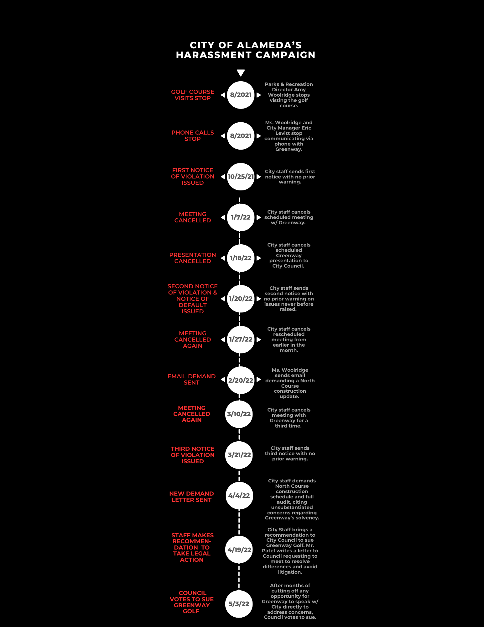 City staff systematically and with no explanation stopped engaging with Greenway Golf shortly before the front nine holes of the North Course redevelopment was completed in October of 2021. Having cut off Greenway’s ability to address any City concerns on an informal basis, they established a pattern of harassment in order to fabricate evidence against the company to bring before City Council with a recommendation to file litigation. No efforts were ever made by City Staff or City Council during this period to engage in conversation with anyone at Greenway before escalating to legal action.